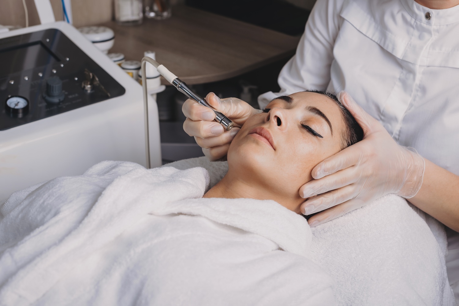 - Soin « hydrafaciale / Hydrapeel » — un soin global combinant gommage, aquapeel, mésoporation, masque sous photobiomodulation. Il repulpe la peau, améliore la pénétration des actifs et redonne de l’éclat.
